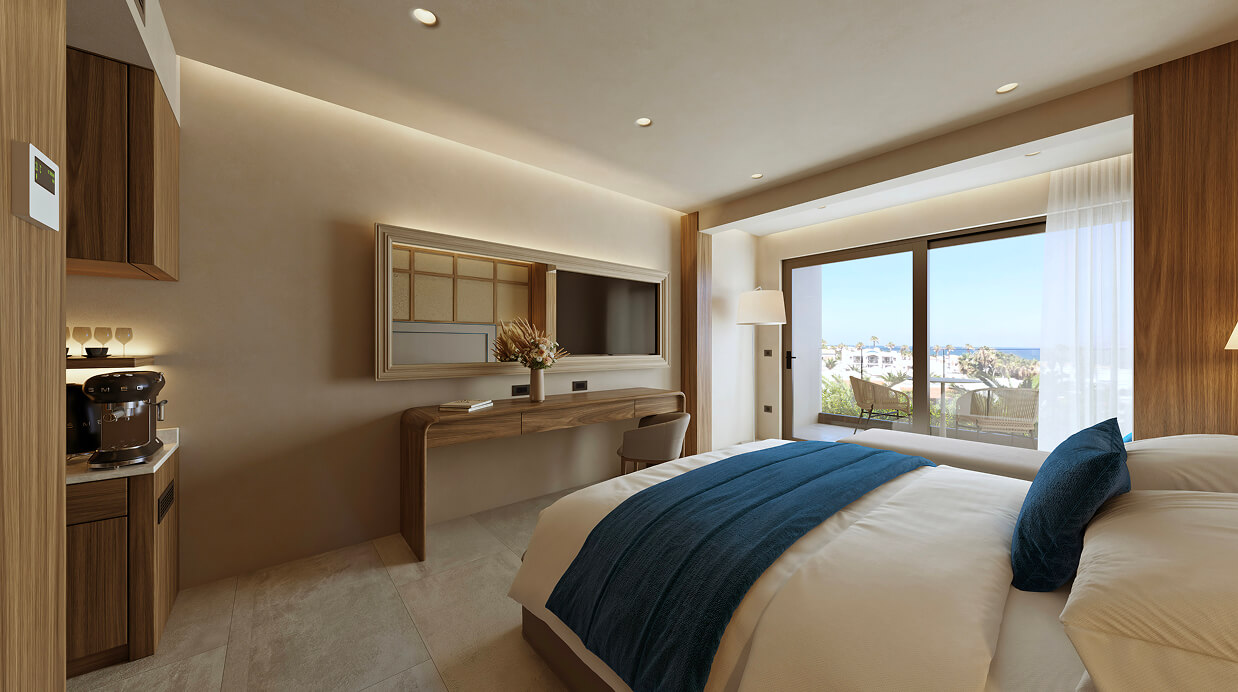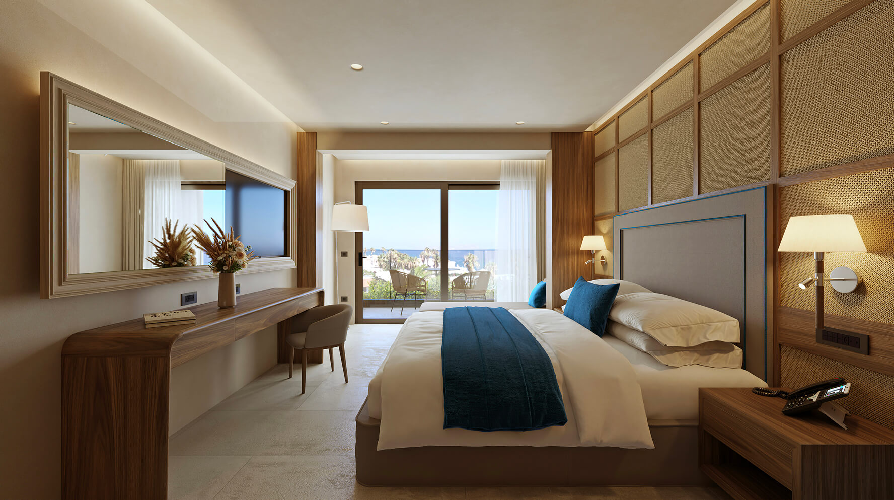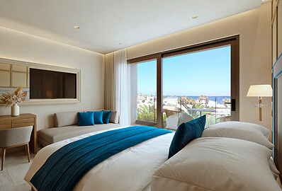 The deluxe suit sharing pool is about 31 - 35 sq.m. open-plan room with Double bed plus one extra single sofa bed. It features a bathtub or shower cabin and WC and has a fully furnished balcony/terrace and floor to ceiling windows. The open plan bungalow has superior quality mattresses and beds to ensure guests the most perfect sleep they could imagine, while air conditioning guarantees the ideal temperature. A daily maid service is available as well as a laundry/dry cleaning service at an extra charge.