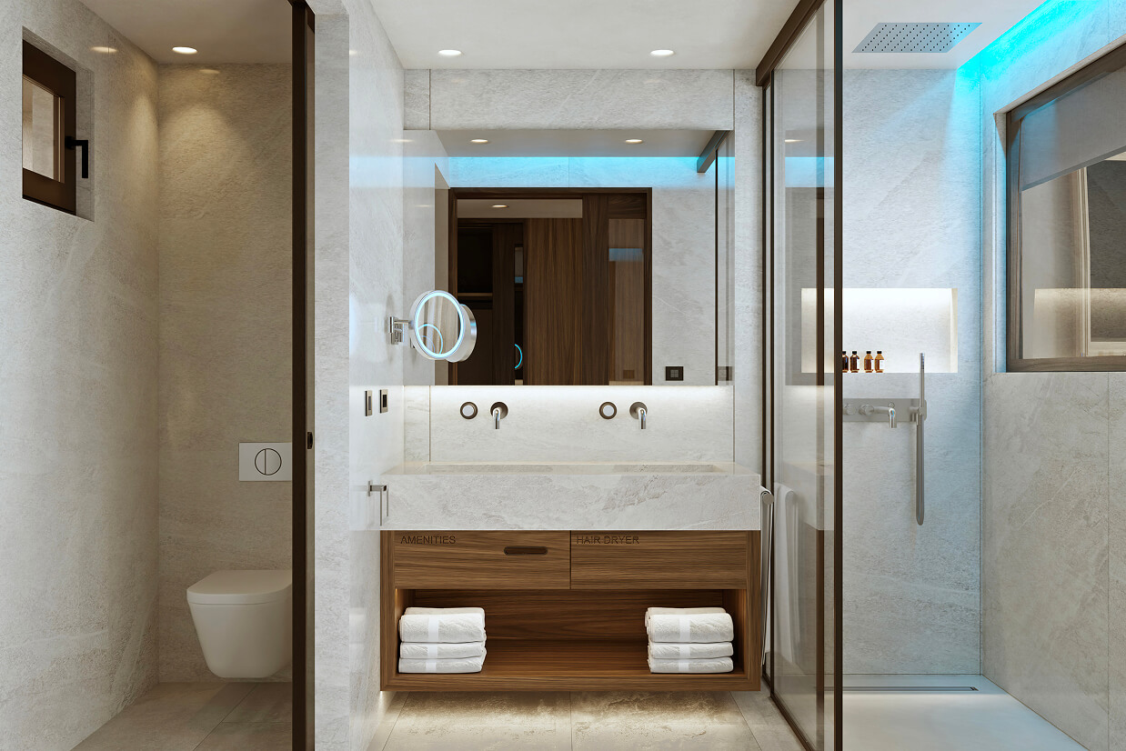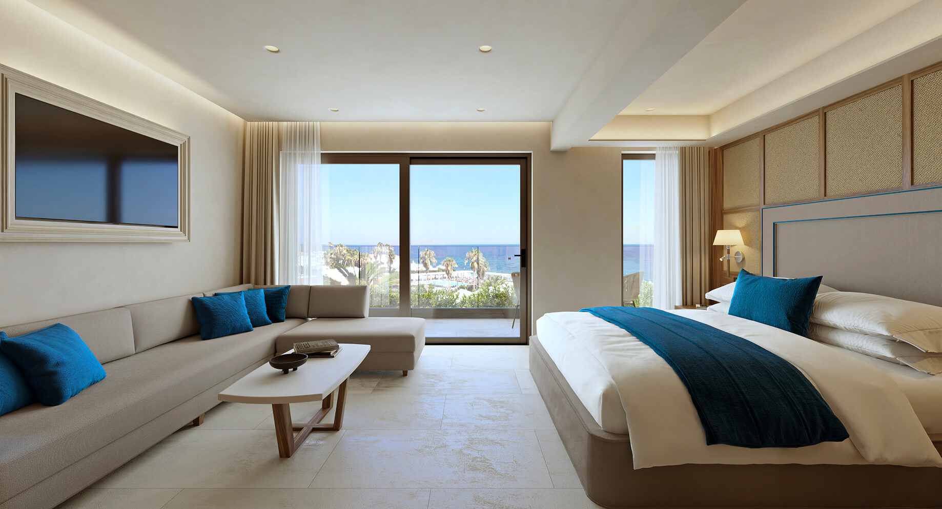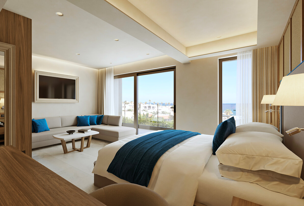 A striking new addition for our guests who prefer a more secluded retreat, where they can enjoy the ultimate pleasures of a 5 star All Inclusive Resort. Luxury Family Suites Water Front are located at a unique and exclusive location.They are an expression of style, with spacious comfortable rooms. The rooms come with two King size beds or one King size bed and two additional sofa beds, meaning they can easily accommodate a family of four. It features an Italian-designed bath or shower, air conditioning and a 49” satellite TV for perfect in-room entertainment.