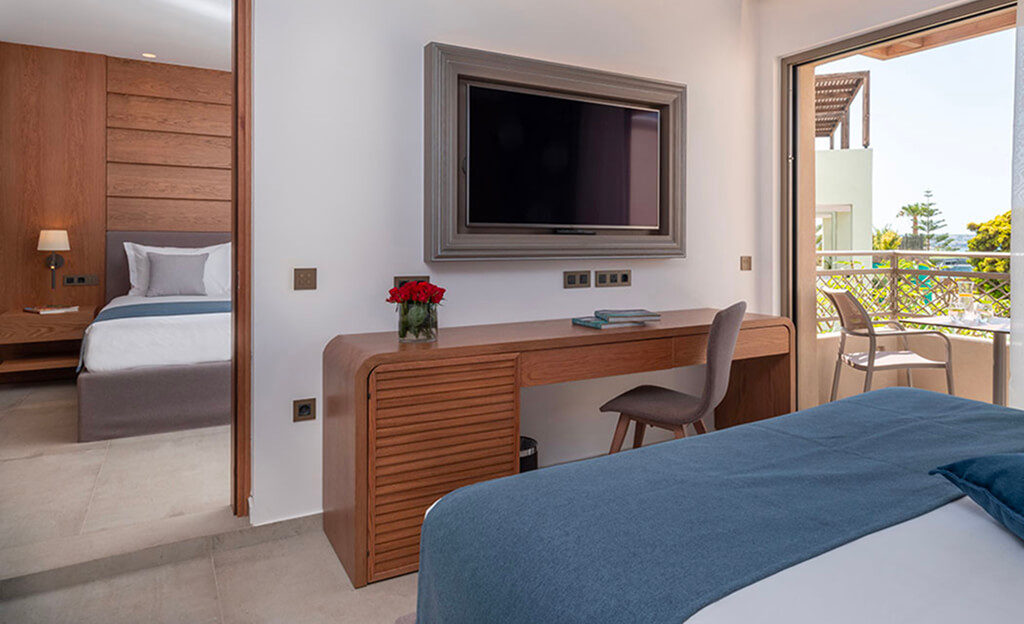 The Prestige 2 Bedroom Family Suite Garden or Sea view is about 45-60 sq.m and has 2 rooms with either 2 King size beds or one King size bed and 2 sofa beds, 2 bathrooms and spacious balcony or overlooking the garden or sea.