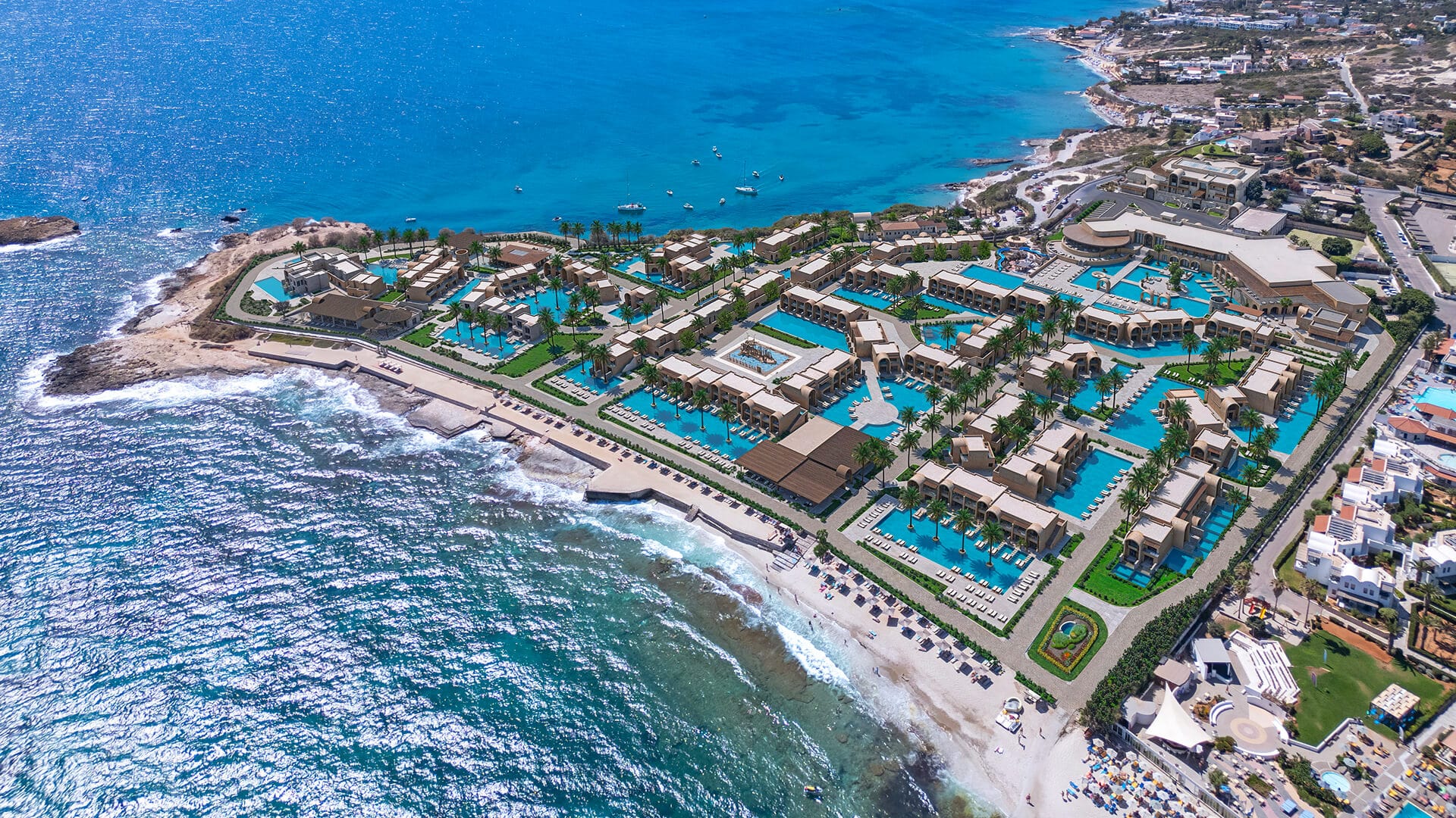 Situated on the north coast of Crete in the charming Hersonissos region, Nana Royal offers an ideal base to explore the island’s rich heritage and vibrant surroundings. The hotel is just 25 km from Heraklion International Airport and within easy reach of the lively towns of Hersonissos (1 km), Stalis (4 km), and Malia (7 km).