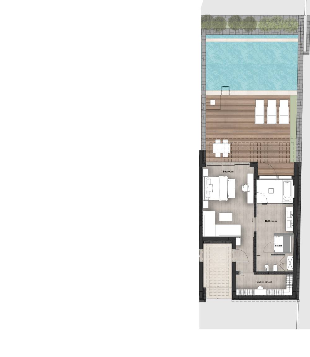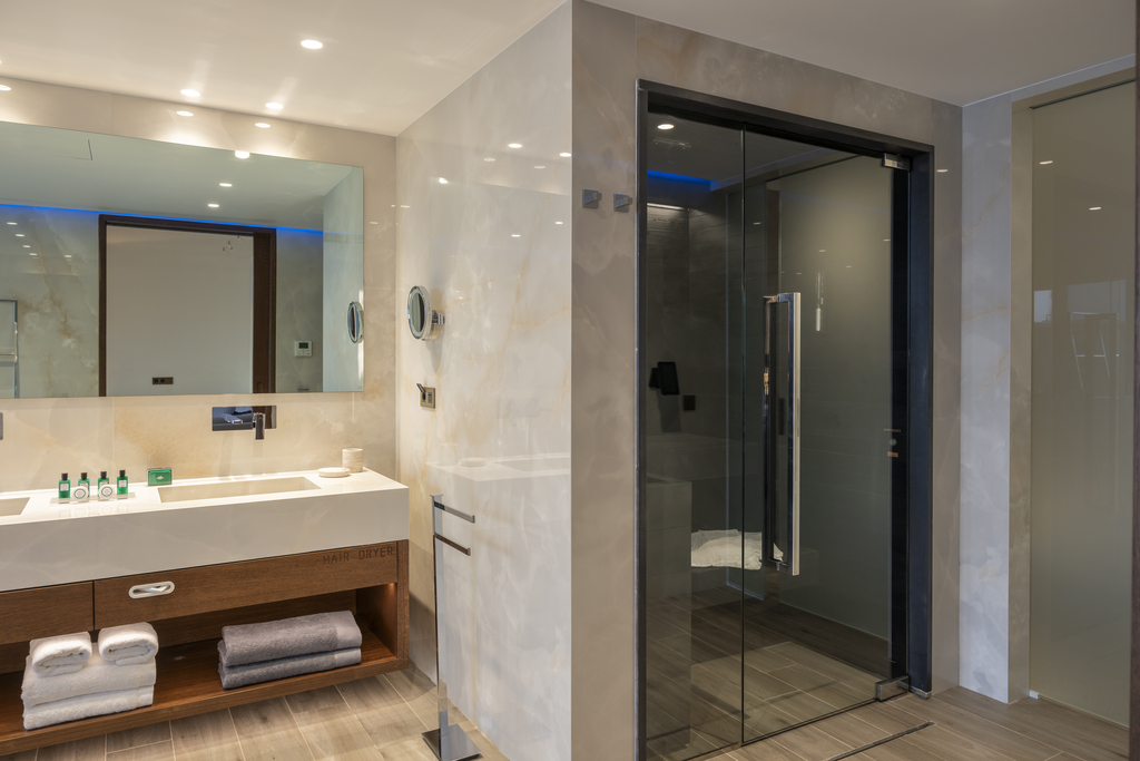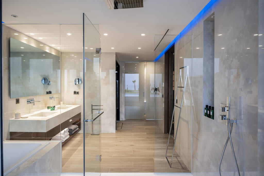 Ощутите элегантность в дизайне открытой спальной зоны и уютной гостиной, плавно переходящих на террасу с шезлонгами и обеденной зоной. Наслаждайтесь современной ванной комнатой для отдыха с успокаивающей паровой баней и световым контролем, положительно влияющим на ваше благополучие. В ванной комнате из ониксового мрамора есть ванна и душ.